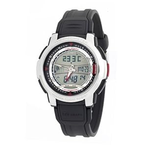 Powerfully styled and packed full of robust timekeeping and environmental features, the Casio Forester analog-digital stainless steel men's watch offers a stylish black sports resin band that will stay comfortable during your most active sport outings. The large round stainless steel watch case measures 42mm (1.65 inches) wide, and it features an Arabic numeral and small minute index readout around its inner rim that interact with the silver skeleton hands. The light blue LCD face provides current time and date as well as a view to current moon phase. It includes a thermometer readout that measures every even-numbered minute, and you can save up to 50 time/temperature data sets. Other timekeeping features include: World time: 30 time zones, 50 cities, city code display, daylight saving on/off 1/100-second stopwatch with 100-hour capacity and following modes: elapsed time, split time, 1st-2nd place times Countdown timer (up to 100 hours) Auto-calendar (pre-programmed until the year 2099) 12/24-hour formats Daily alarm Hourly time signal (which can be turned off) This watch also features a ±30-second accuracy per month, Afterglow backlighting, and water resistance to 100 meters (330 feet)--offering protection from accidental splashes as well suitable for swimming, snorkeling, and light recreational diving.